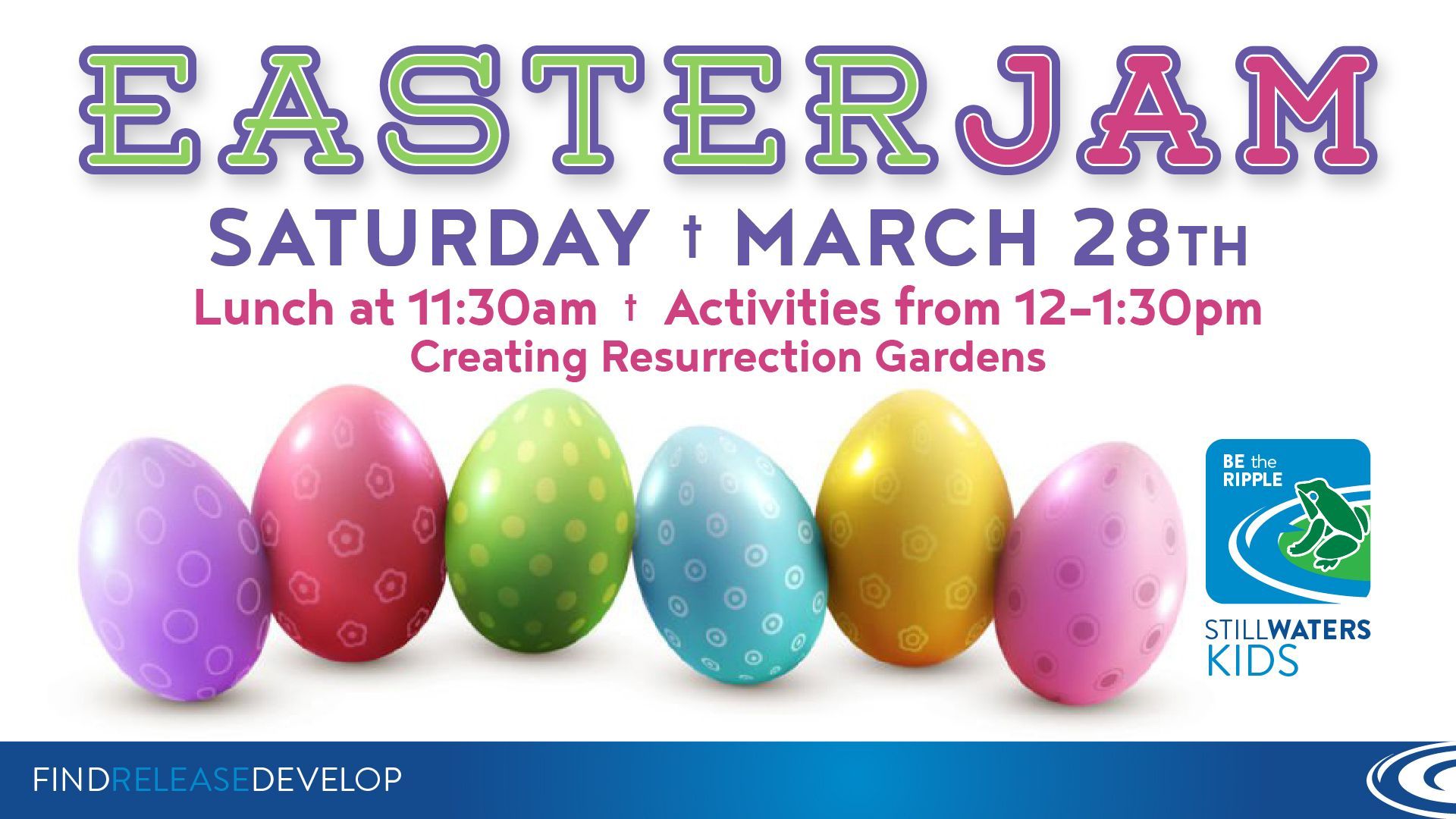 Come join us for our Family Easter celebration called Easter Jam! This year we will be making Resurrection Gardens and enjoy an Easter egg hunt! Easter Jam will be on Saturday, March 28th. Come for a meal at 11:30, activities from noon-1:30. Thanks to our Still Waters Women or helping with the Easter Egg Hunt. This will be a fun and meaningful event!