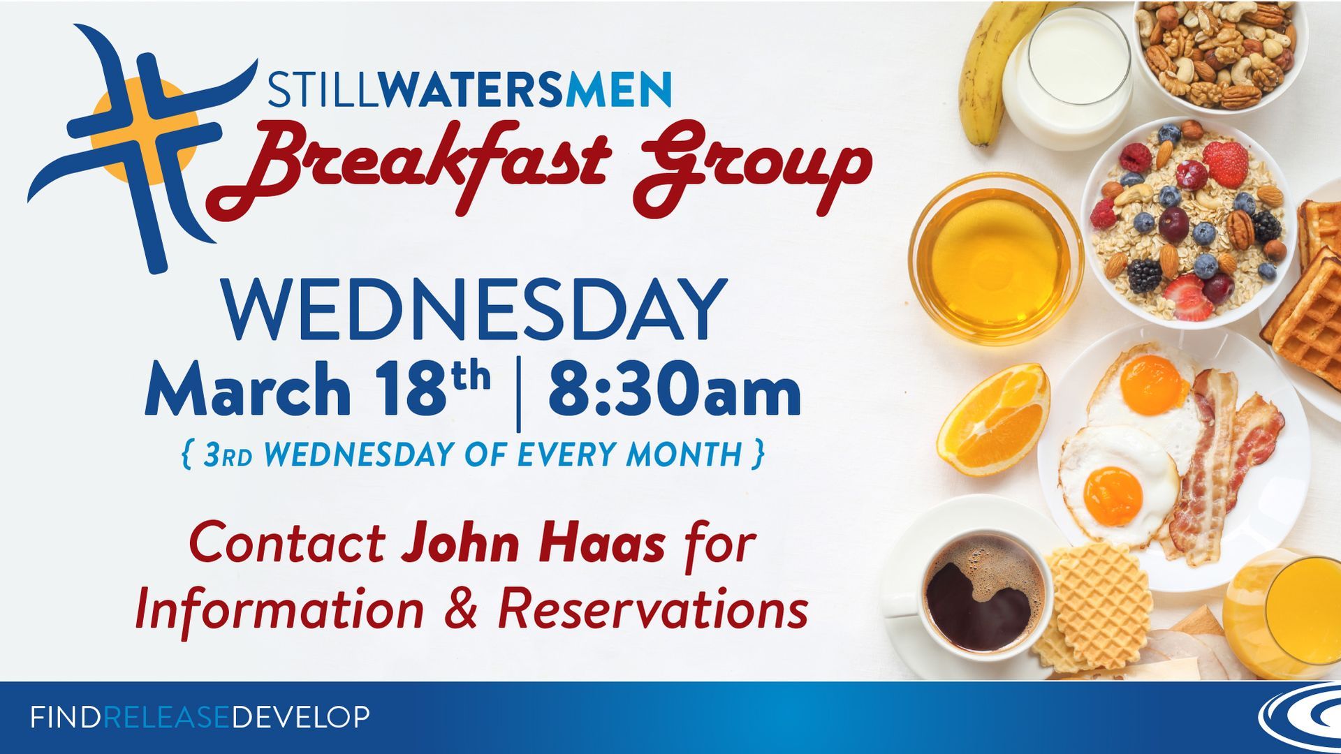 Men are invited to this monthly men’s breakfast, 3rd Wednesday at 8:30 a.m., meeting at a local restaurant (which switches from month to month). Contact John Haas at 262-617-7004 or by email to sign up for this month’s breakfast! (John calls the restaurant to make a reservation, so please contact him by Tuesday, March 17.)