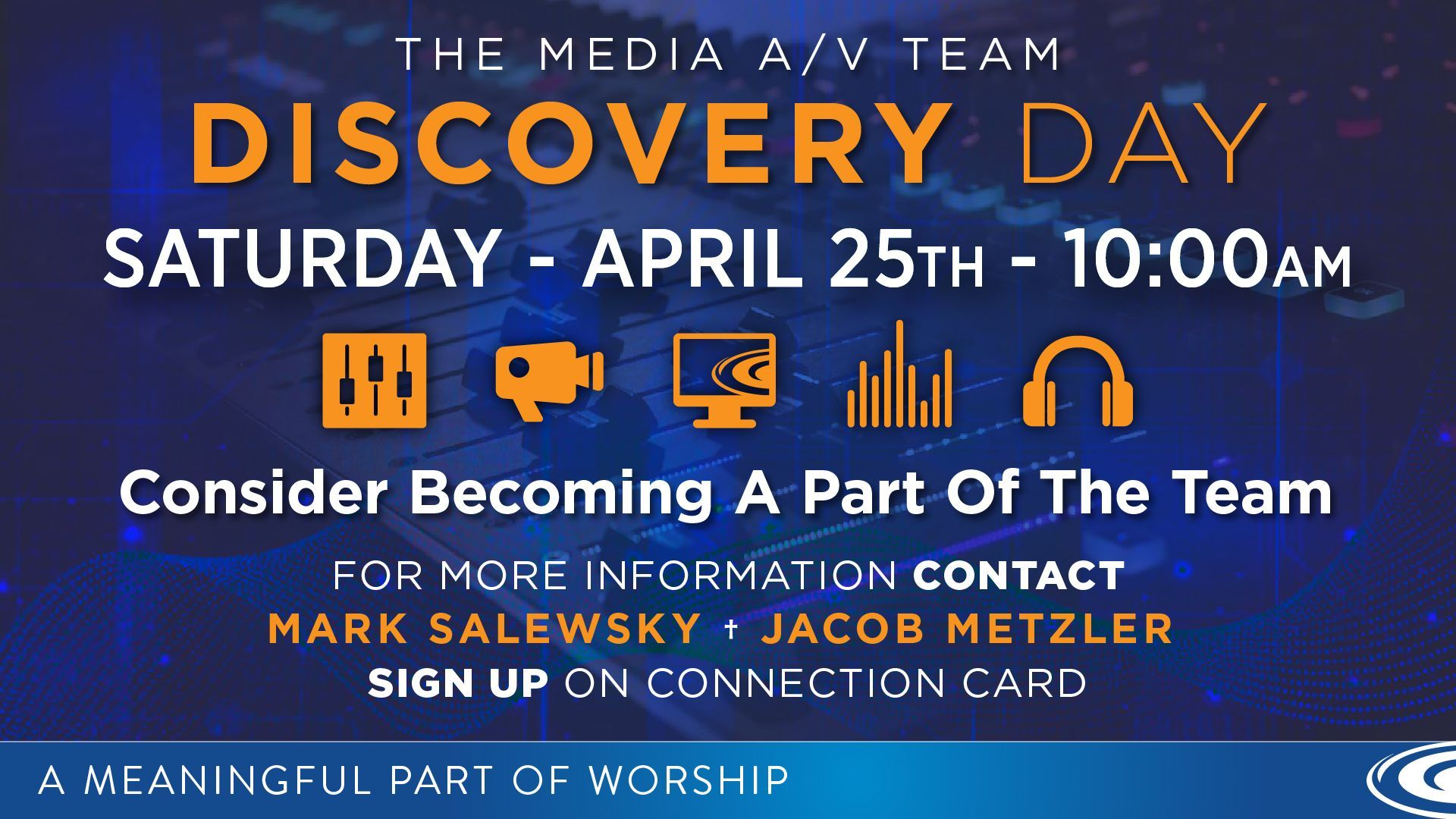 You are invited Saturday, April 25, 10:00 a.m.! We have embarked on an amazing journey in Still Waters' audiovisual ministry! Maybe you’re curious and would like to see a few things on how it works or what it's about. Maybe you’re already involved and know tons! You can come for half an hour or stay to learn more in-depth.
