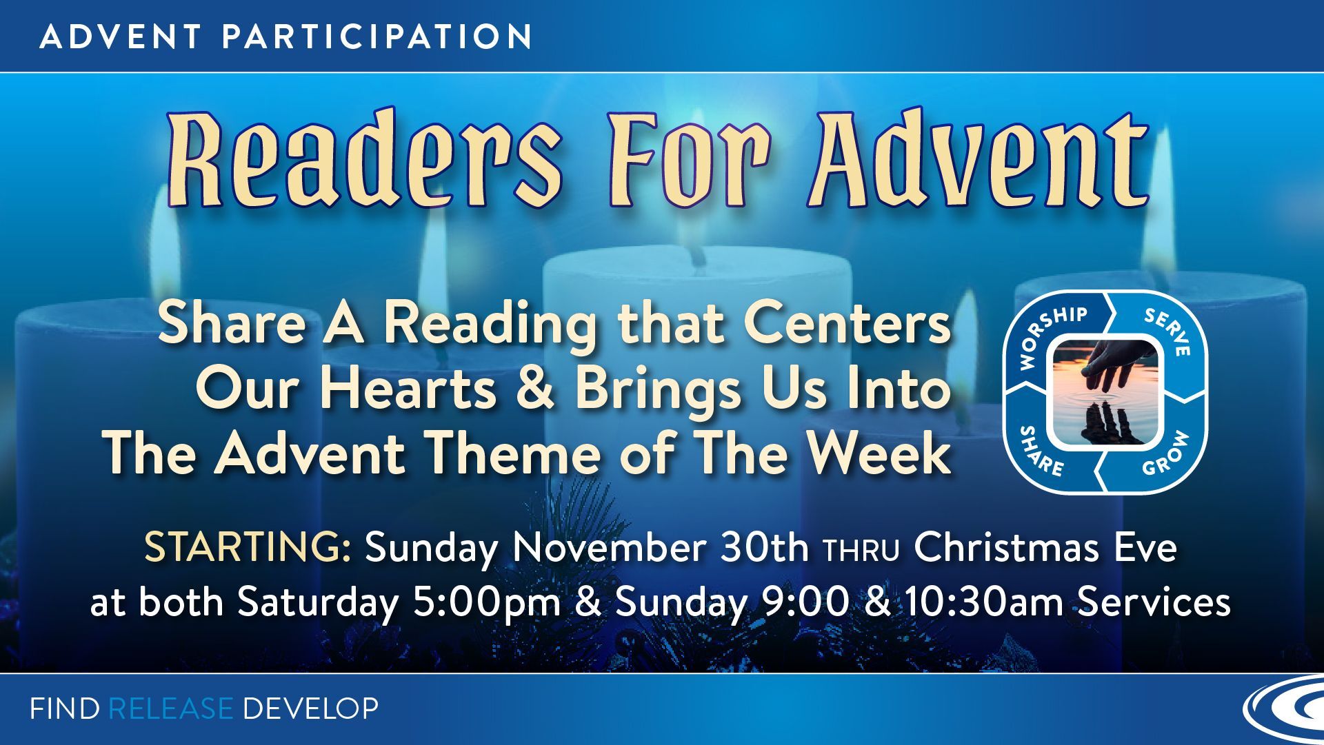 In addition to but different than the Advent Candle Lighters, we will have a Reader who will share a reading that centers our hearts and brings us into the Advent Theme of the week. This person will practice the reading once on one of two Monday evenings or after worship on a Sunday. Sign up for the day and time of the worship service in which you’d like to participate, and we'll look to find a practice date corresponding to that service.