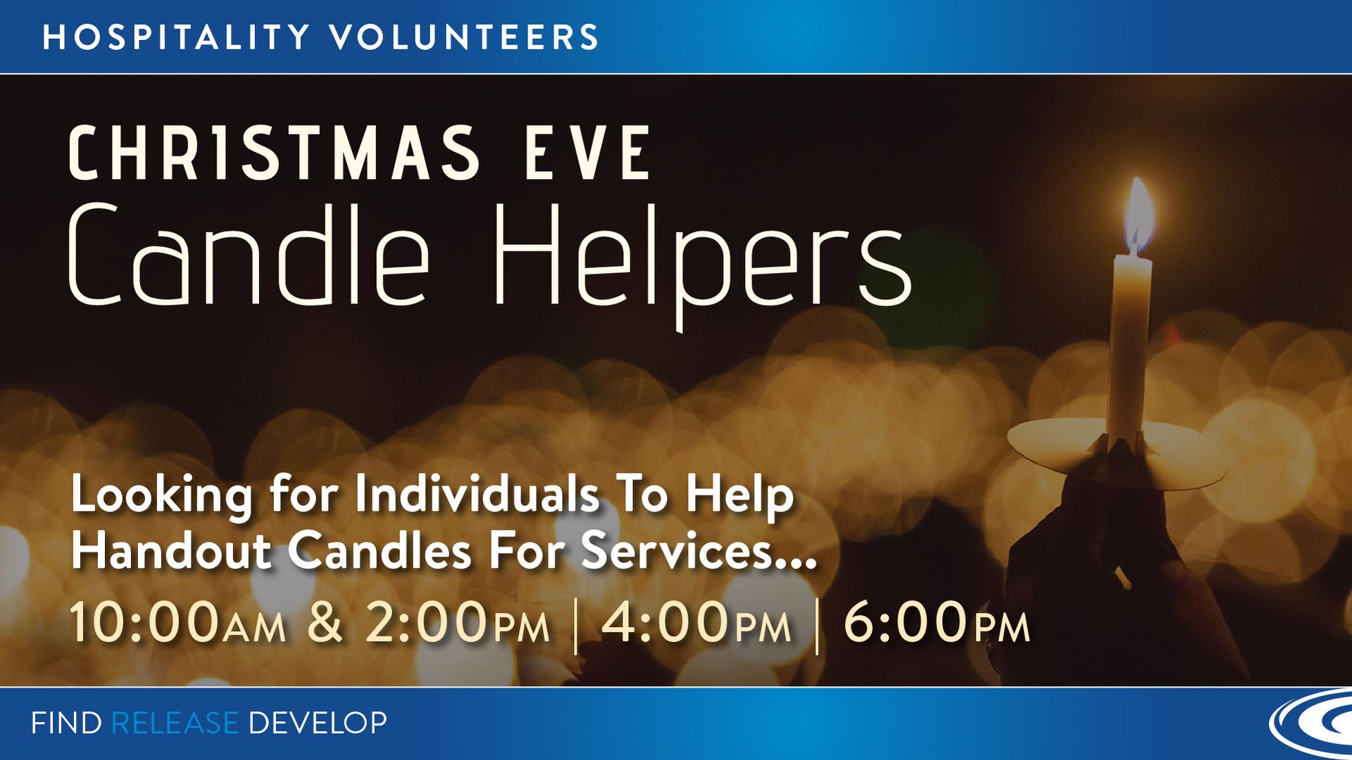 On Christmas Eve, we will expand our hospitality team to add the servants who will greet people as they enter the sanctuary and distribute candles! This is a great time to try out hospitality, and play a special role giving candles out to those who come to worship. We still have serving opportunities at the Christmas Eve 2:00 service. Thank you for considering on serving on an evening when many guests are seeking the hope of Christ! Sign up on the Connection Card or online.