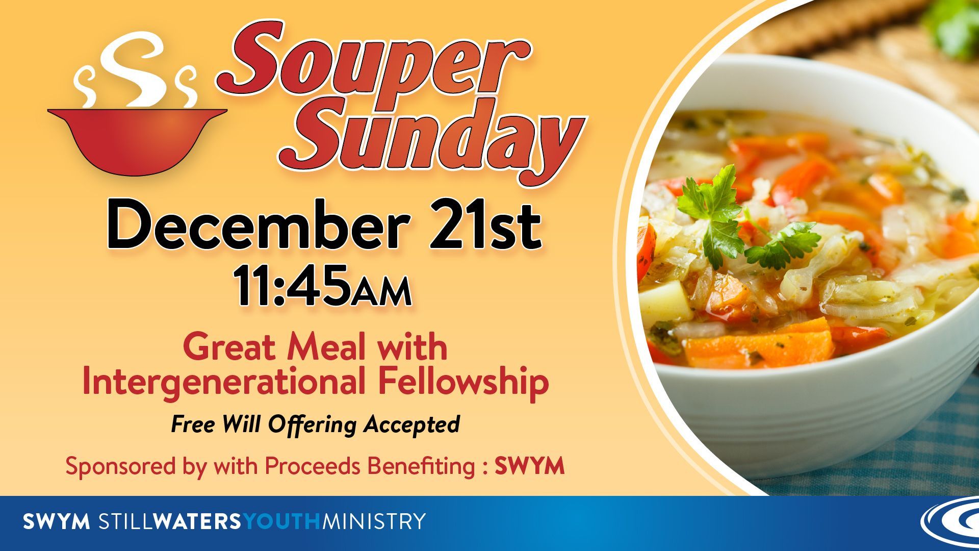 Yes, we are having Souper Sunday on December 21! As we prepare for Christmas, let’s take this time to connect around the table at our “Souper Sunday,” which is an awesome meal for our congregation, sponsored by our youth on the third Sunday of each month. Come for a great meal/intergenerational fellowship. Free will offering accepted, and proceeds will benefit our amazing youth ministry.