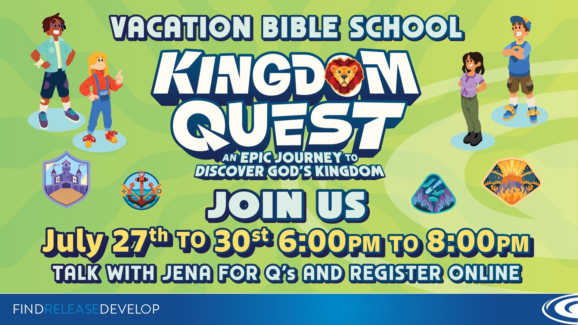 It's time to start thinking about Vacation Bible School! Our theme this year is Kingdom Quest and we'll be discovering what it means to live in the kingdom of God today! Dates are Monday July 27 through Thursday July 30 from 6pm-8pm each night. Each day we'll go through centers of music, games, crafts, and Bible adventures. The final day (July 30th) will be Family Night where family and friends are invited for a short program and stay for a cookout and a bouncy house in the back area of the church! Please contact Jena Metzler with any questions up to the month of July. Come July, Lisa Paulson will be stepping in as coordinator and will be able to answer any questions since Baby Metzler will be making her arrival around that time!