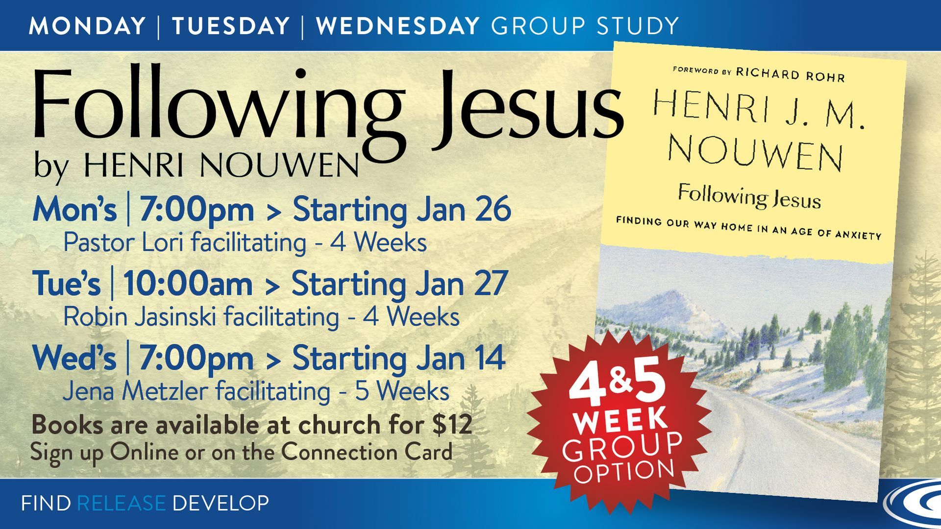 Join us as we study Henri Nouwen’s book, “Following Jesus: Finding Our Way Home in an Act of Anxiety.” Without minimizing the anxieties, fears, and brokenness that touch down in every reader’s story, Nouwen gently leads the way into a life that centers on Jesus and engulfs the follower with God’s love, a sense of belonging, and a purpose that endures.
